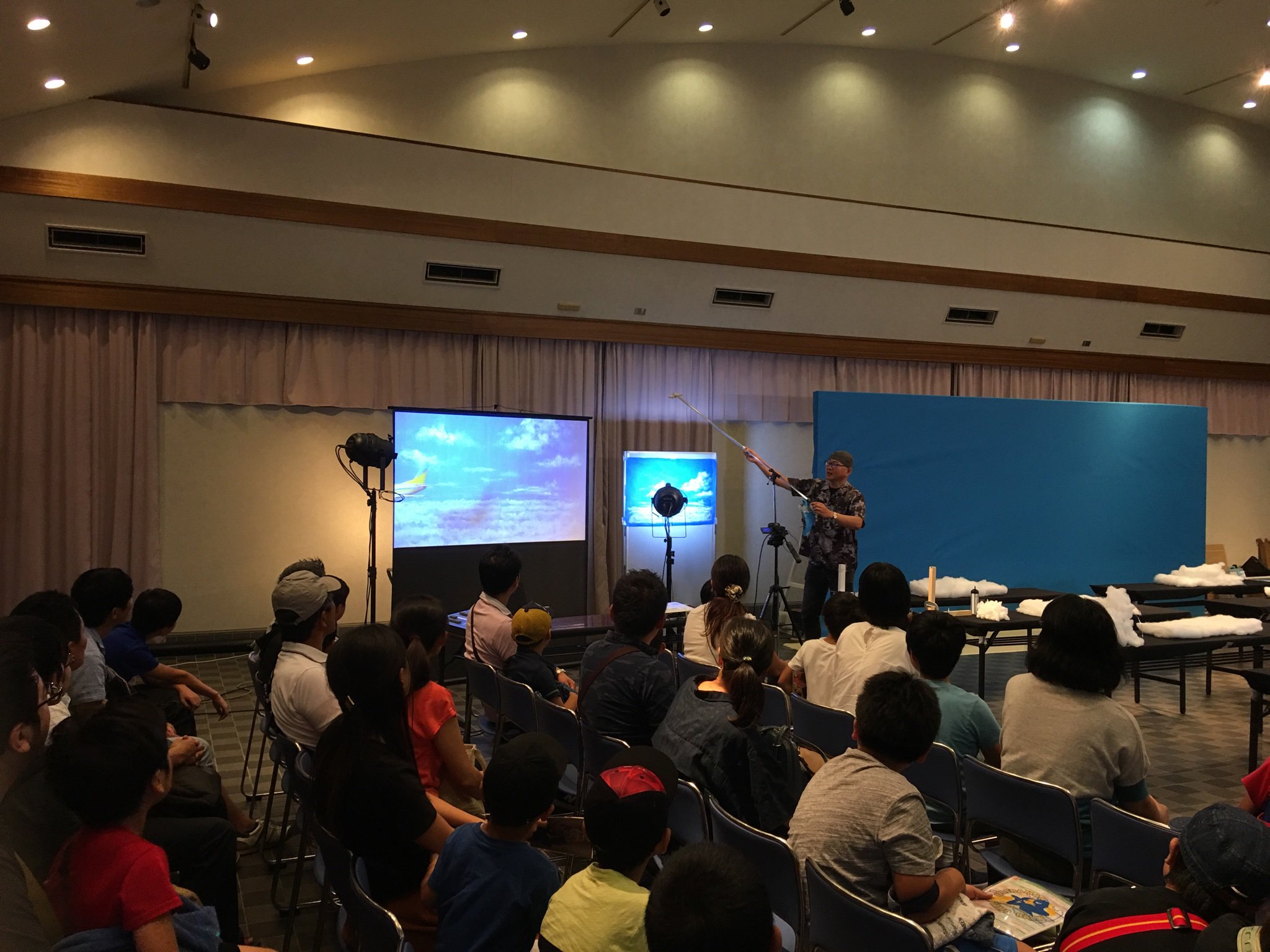 郡山市カルチャーパークにて、特撮ワークショップ 綿で雲をつくってみよう、始まりました。 まずは講師・三池敏夫からの説明です。 #特撮ワークショップ #ATAC